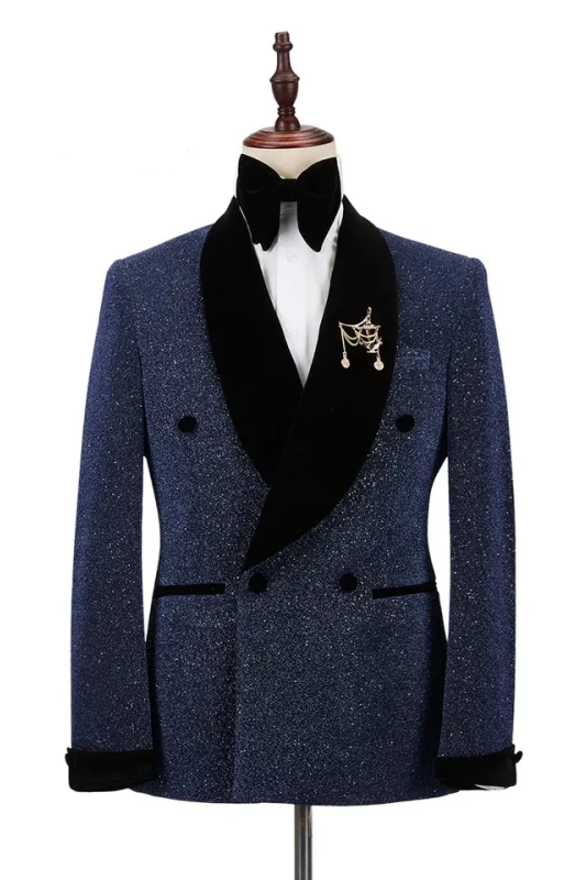 Steven Navy Blue Sequins Double Breasted Close Fitting Wedding Suits With Black Velvet Lapel