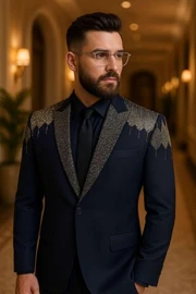 Tate Dark Navy Peaked Lapel Jacquard Men Suits For Prom