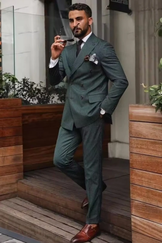 Tiffany Dark Green Peaked Lapel Striped Double Breasted Prom Men Suits