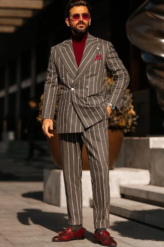 Vincent Fashion Gray Striped Peaked Lapel Double Breasted Men Suits